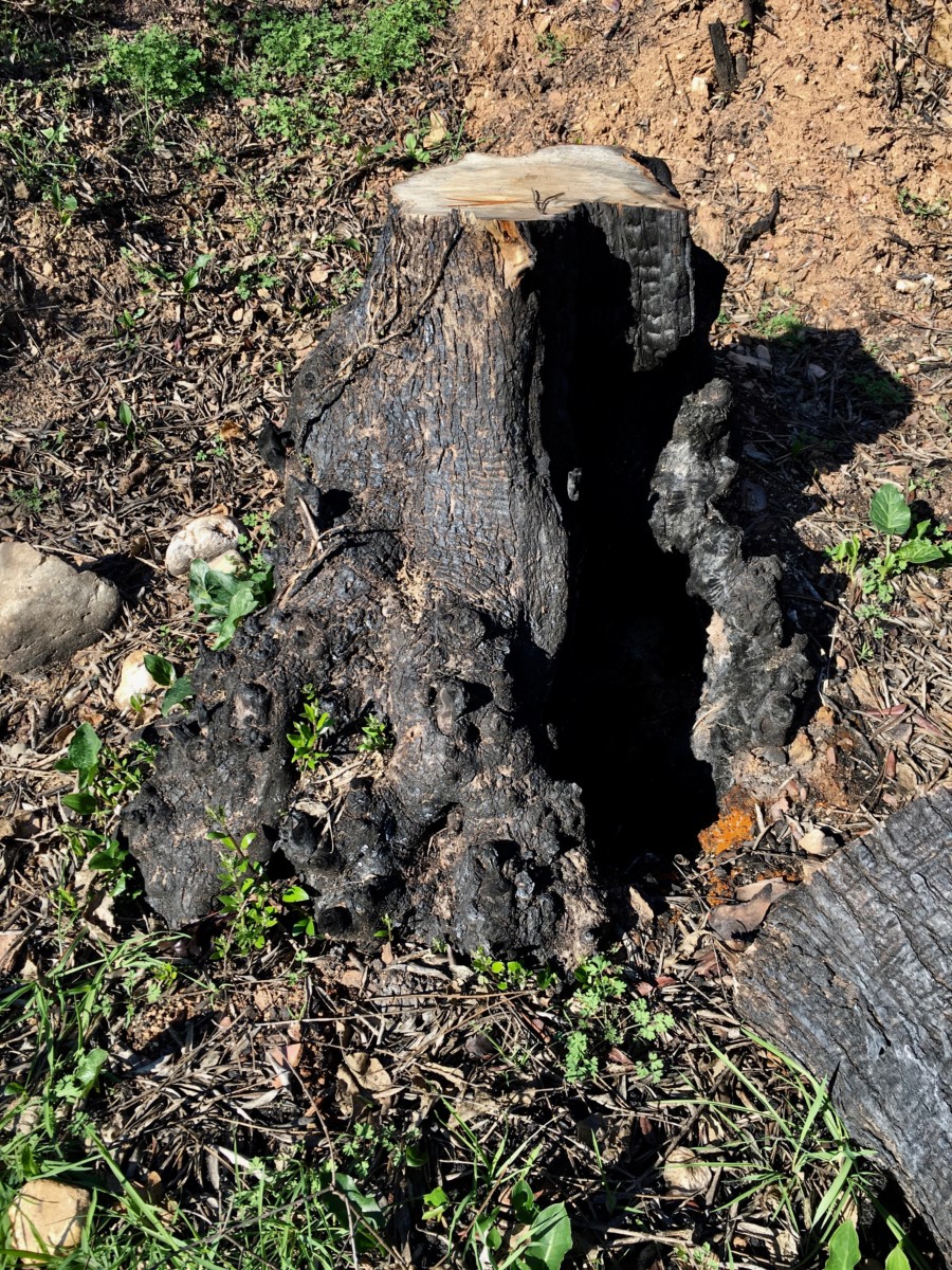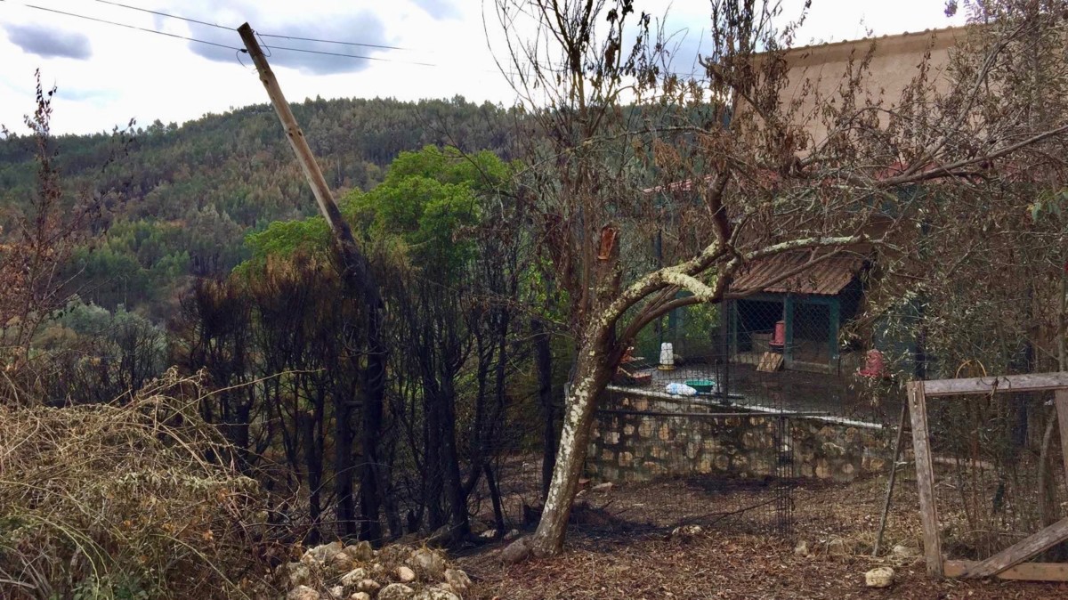 We hebben een bescheiden stuk grond rondom het huis. Een deel daarvan is afgebrand. Onder andere de helling die vanaf ons huis naar beneden loopt, bijna tot aan de rivier. Ons mooie uitzicht, waar we elke dag van genoten. Op deze helling was een oude olijfboomgaard met een stuk of 25 prachtige oude olijfbomen. Ze zijn allemaal verbrand en zodanig dat ze het waarschijnlijk niet meer gaan redden. De oude, dikke stammen zijn van binnenuit helemaal opgebrand. Wat er nog over is zijn holle stronken. De takken zijn verbrand en eraf gevallen.