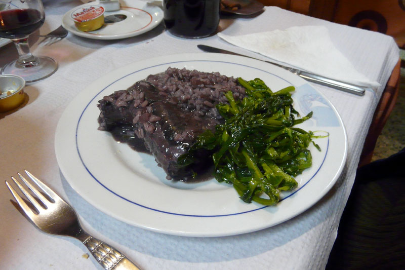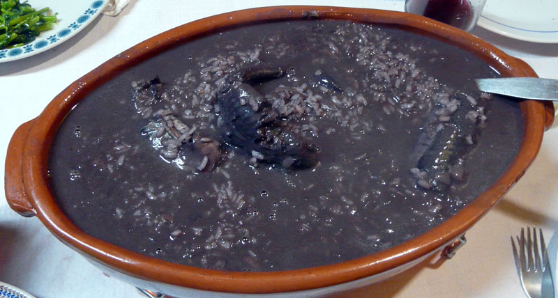 Die werd geserveerd in een platte lage schaal en zag eruit als een enorme hondedrol in een berg grijsbruine rijst (de kleur komt door het bloed). Moedig begonnen we te eten … het smaakte heerlijk. De smaak en ‘bite’ is anders dan vlees en anders dan vis, iets heel aparts.