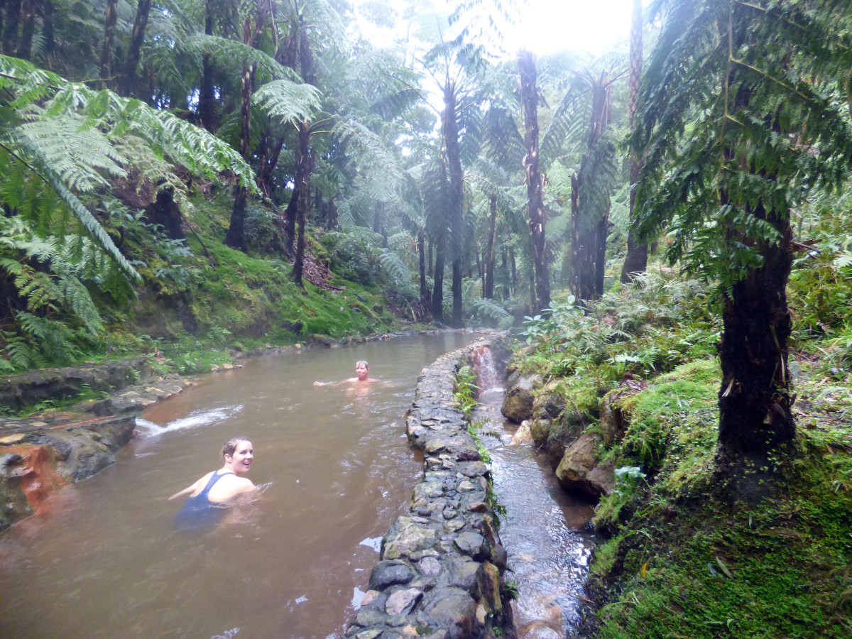 In het Parque Terra Nostra in Furnas kun je – behalve 350 soorten camelia’s bewonderen – ook zwemmen in een grote vijver. Het water is bruin, omdat ijzerhoudend is. Aangeraden wordt om niet je nieuwste bikini aan te trekken, je kunt hem daarna weggooien, hij is helemaal bruin. Het thermale water stroomt met 42 graden de vijver in. Heerlijk, vooral als het weer nat een guur is. Toegang tot het park en vijver: € 6,–.