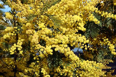 Ieder jaar in februari bloeit de mimosa. Dit jaar was het wat later, ik denk door de koude en droge winter. Maar sinds een paar weken is de hele omgeving weer geel. Het is prachtig, vooral als de zon erop schijnt, en het ruikt naar voorjaar!