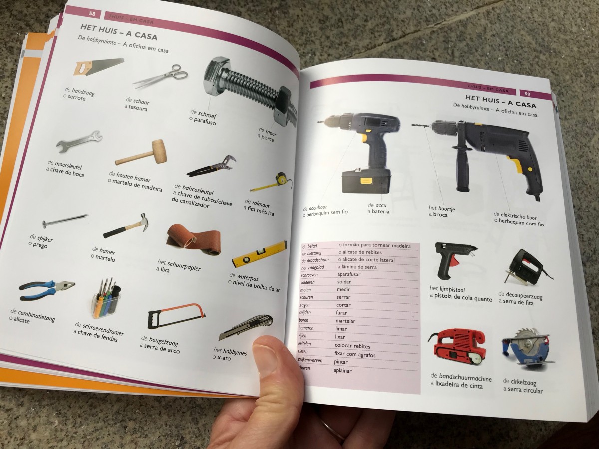 Het Van Dale Beeldwoordenboek Nederlands/Portugees heeft dertien hoofdstukken, met elk een thema. Bijvoorbeeld alles over computers of alles over doe-het-zelven. Het is leuk om door te bladeren en je eens wat grondiger in zo’n onderwerp te verdiepen. Het staat vol met eenvoudige woorden die je in het dagelijks leven tegenkomt. Dus niet, zoals bij taalgidsjes, alleen woorden voor als je op vakantie of op reis bent.