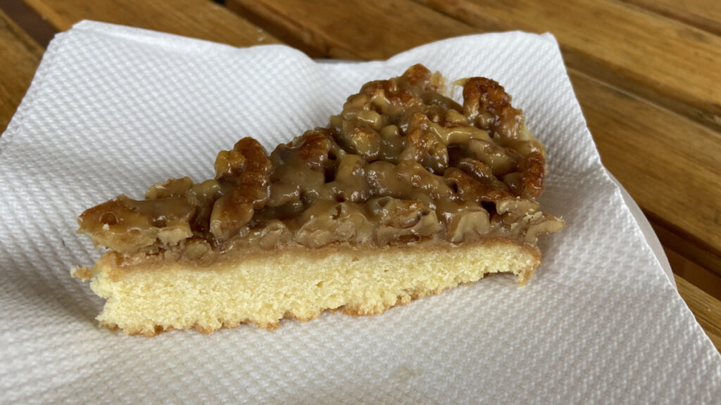 We eten de taart zoals onze dorpsgenoten op het verjaardagsfeest: uit de hand, van een servetje.