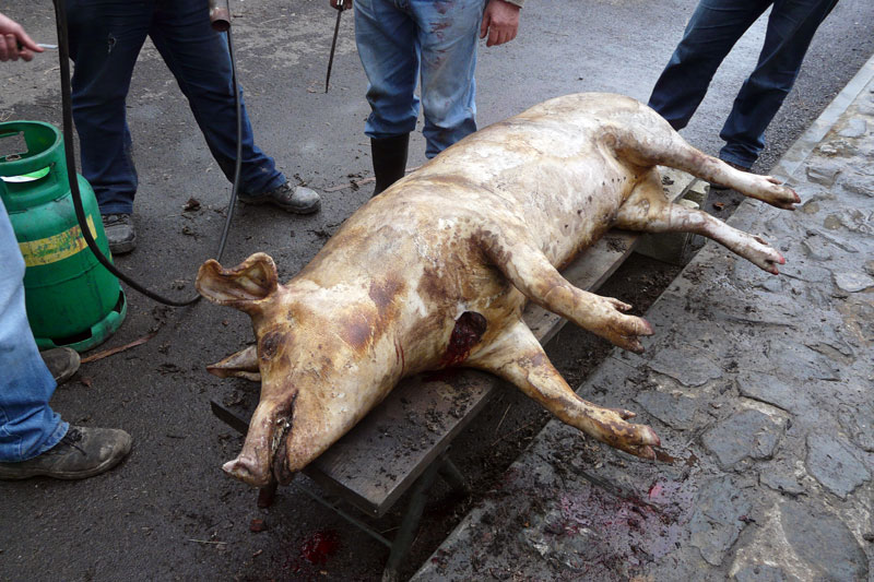 Het doden van het varken vond plaats bij de stal, aan een klein paadje helemaal onderaan het dorpje. Daarna werd het varken op een houten plank omhoog gedragen, naar het centrum van het dorpje en vervolgens met een vrachtwagen verder omhoog gereden naar het huis van Vasco en Jane.